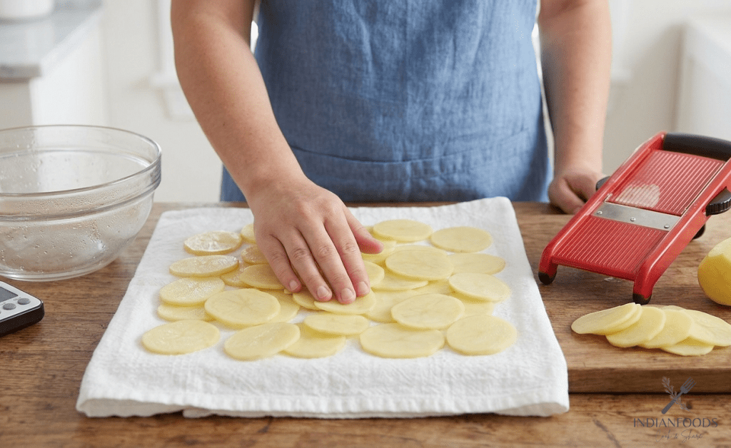 • This is to make sure that the potato slices are uniform in thickness in order to cook evenly. When they are too thick the potato will not be cooked up; when too thin they will be burnt.